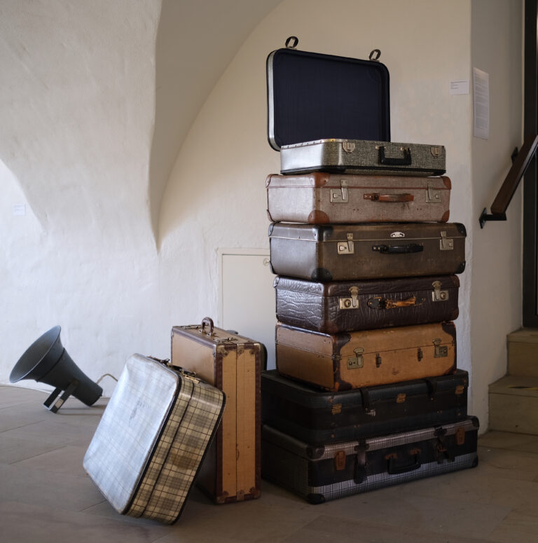 In der Installation öffne ich die Koffer für die Besucher, doch auf den ersten Blick sind sie leer, jedoch bald schon hört man die Erinnerungen des Verschwindens aus dem Objekt. Der Koffer, der leere Koffer, ist hier nicht nur Symbol sondern erst durch den Koffer werden die Töne wahrnehmbar, denn die Koffer sind tatsächlich die Lautsprecher, die Wandler, sie reaktivieren die konservierten Schwingungen und erfüllen die Luft des Jetzt mit den Tönen der Erinnerung und so besteht die Chance, auch jetzt und hier, für ein paar Augenblicke zu verschwinden; um anzukommen.
