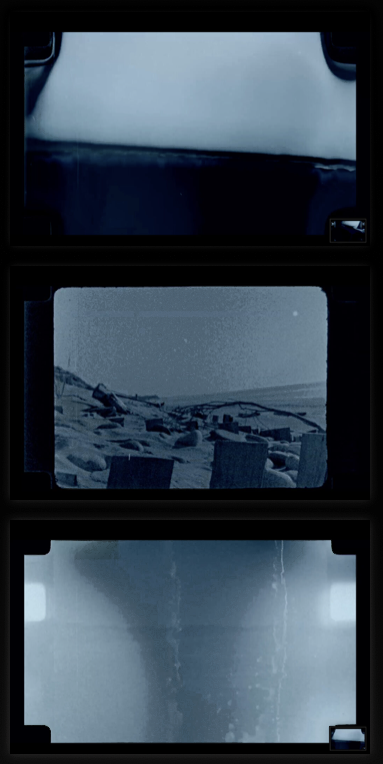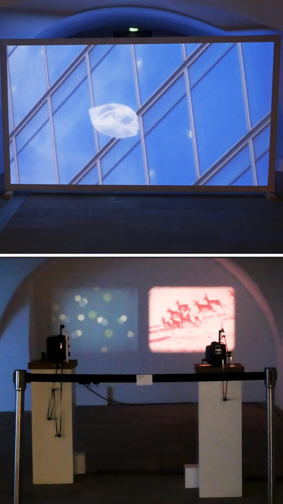 Zwei Super-8-Projektionen laufen als Endlosschleifen. Die Filme werden mit 6 Bildern pro Sekunde über Führungsrollen im Kreis geführt. Die Schleife erzeugt eine kontinuierliche, kreisförmige Bewegung – eine ununterbrochene Bildfolge. Wiederholung wird zum Prinzip: zugleich beruhigend und verstörend.