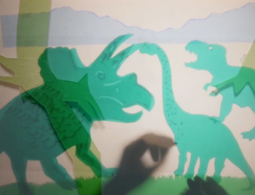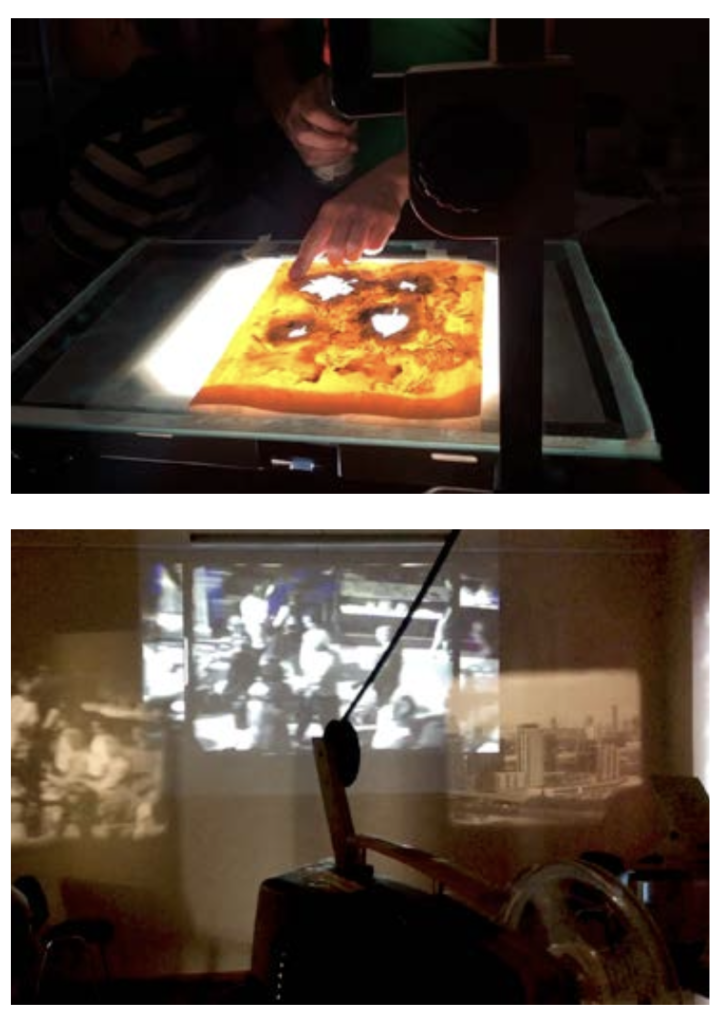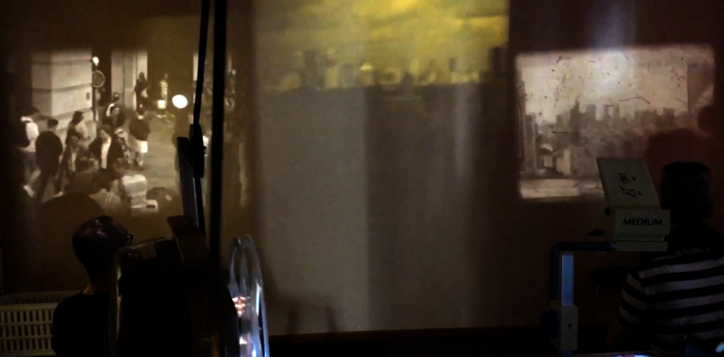 Live Foleys und Musik, Live Projektion, 8mm  und 16mm, Live Zeichnungen, Malerei und Collagen über Leuchttisch