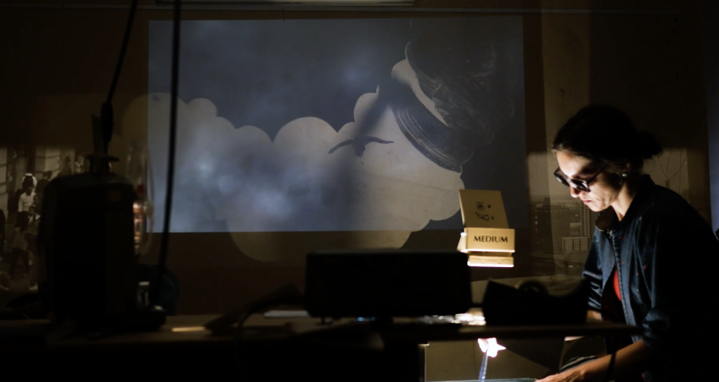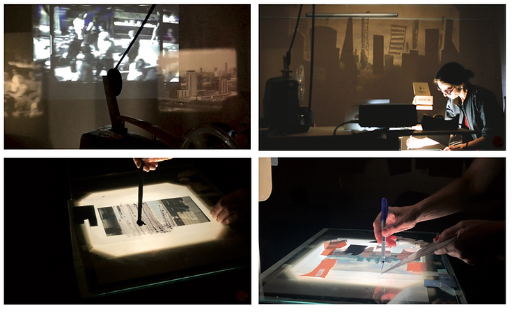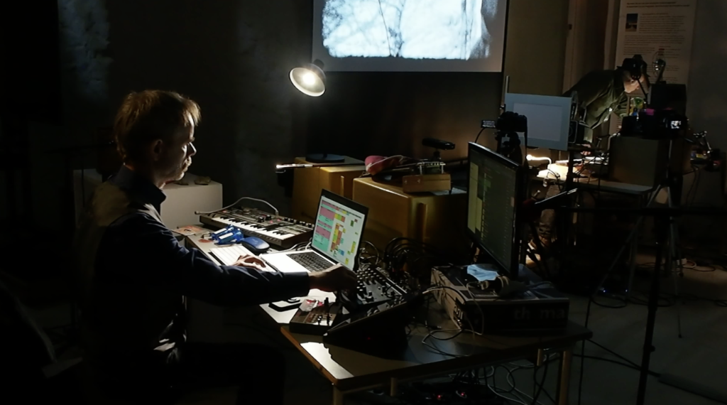 „Eine interdisziplinäre Live-Performance, bei der Musik, Geräuschkunst, analoge 8-16mm Projektionen, Zeichnung, Malerei und Collage gleichzeitig entstehen und sich vor den Augen des Publikums zu einem in Echtzeit erzeugten Film verdichten.“