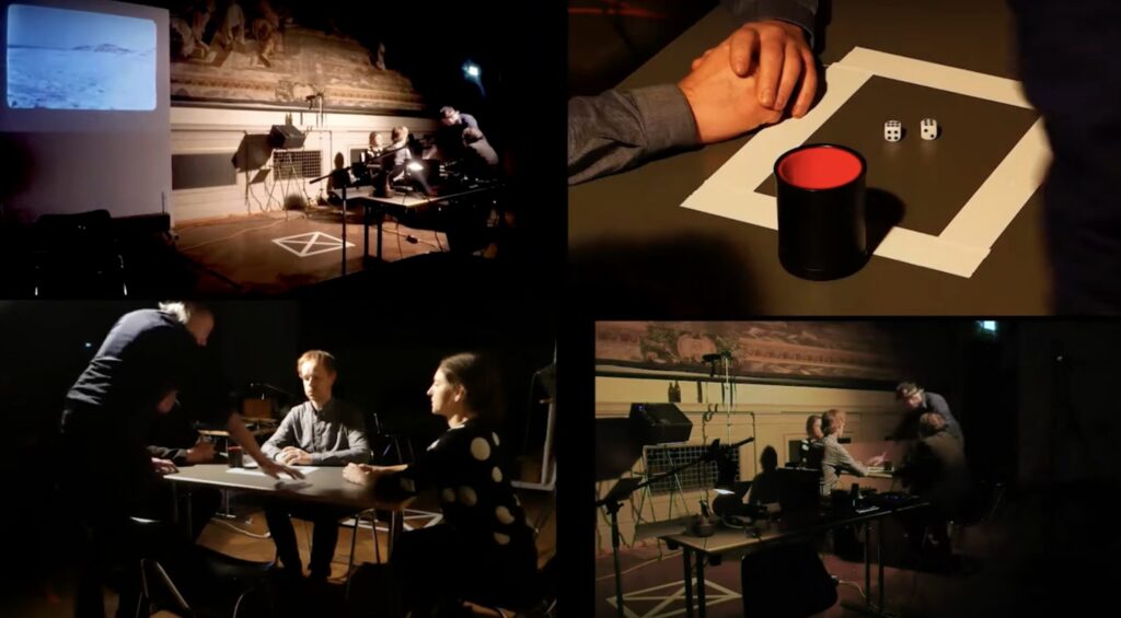 sehr alte Filmaufnahmen zeigen die Zukunft der Erde, als menschenleeres Gebiet. In der Mitte ist ein abgestecktes Gebiet mit einem Mittelpunkt, der nicht betreten werden darf. Sowie ein Tisch mit allerlei akustischen Geräten. Rechts, auf der Seite der Logik, sehen wir vier Personen die Würfeln. Immer wieder scheint das Ergebnis der Würfel einen Spieler zur Tat aufzufordern. Die Performance beginnt.